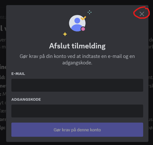 - Til sidst kan du nu vælge at færdiggøre opretningen af din Discord bruger, eller klikke på krydset markeret i billedet nedenfor.