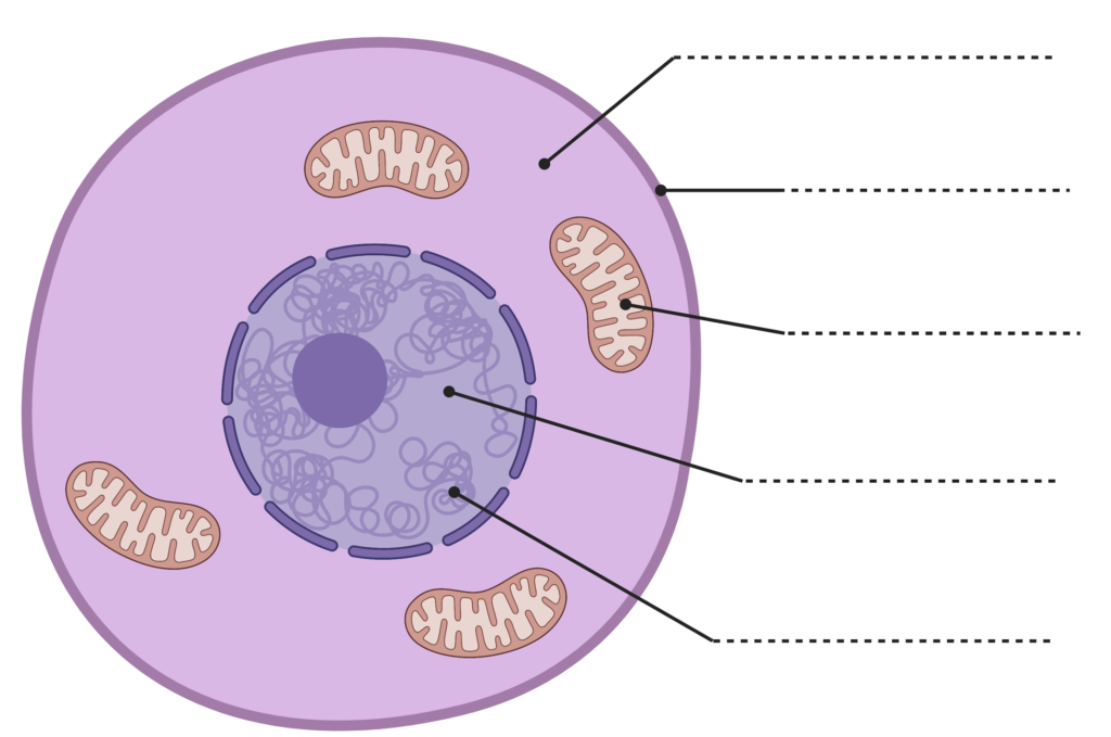 Cellemembran, cellekerne, cytoplasma, DNA, mitokondrie