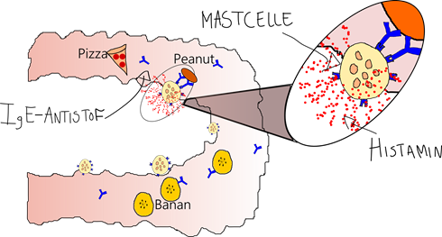Lige så snart to IgE-antistoffer binder til peanuten vil det medføre at mastcellen vil gå i gang med sit immunsystem-job. I dette tilfælde vil mastcellen producere og frigive histamin. Histamin er et kemisk stof, der får blodårerne til at udvide sig, sådan at der kan komme mere blodtilførsel til området. Hvis der frigives for meget histamin, så hæver området meget op, hvilket her betyder, at du får rigtig ondt i maven.