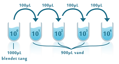 Figur 2. Fremgangsmåde for at lave en fortyndingsrække af den filtrerede tangblanding. Det gøres på følgende måde: Klargør fire rør og skriv 101, 102, 103 og 104 på dem med sprittus. I 101-røret vil tangblandingen blive 101 =10 gange fortyndet, i 102-røret vil blandingen blive 102 = 10∙10 = 100 gange fortyndet, i 103-røret vil det være 103 = 10∙10∙10 = 1000 gange fortyndet og i 104-røret vil den oprindelige tangblanding blive 104 = 10∙10∙10∙10 = 10.000 gange fortyndet. Selve fortyndingen laves ved at starte med at komme 0,9 mL = 900 µL hav- eller søvand i hvert af de fire rør (101, 102, 103 og 104) med en pipette. Der overføres nu 0,1 mL = 100 µL af tangblandingen fra 100-røret til 101-røret, og der blandes grundigt ved at røre rundt med pipettespidsen. Derefter tages 0,1 mL = 100 µL fra 101-røret og overføres til 102-røret, og der blandes igen. På samme måde overføres 0,1 mL = 100 µL fra 102-røret til 103-røret, og efter en grundig omrøring overføres der fra 103-røret til 104-røret. For hver overførsel mellem rørene fortyndes der altså 10 gange. Jo mere man fortynder, desto færre bakterier er der til stede. Husk at skifte pipettespids mellem hver overførsel. Fremgangsmåden kan desuden ses i figur 2.