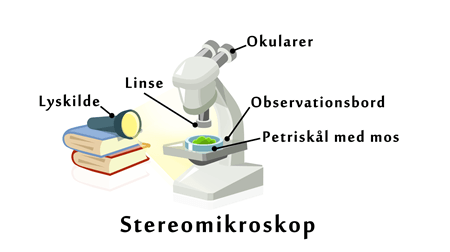 Tip: Der vokser ofte mos på skyggefulde steder, for eksempel under træer. Fugtige steder, som ved et lille vandløb, plejer også at være gode til at finde mos ved.Observation af bjørnedyr - Det indsamlede mos og eventuelt en lommelygte tages med i skole.