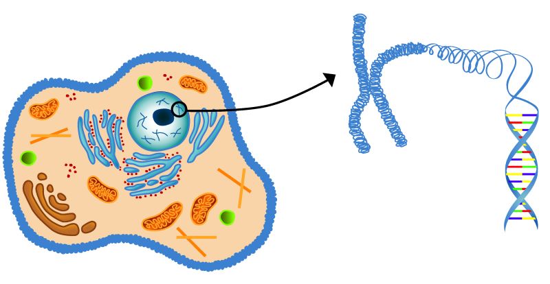 Figur 3. Kromosomer og DNA. Kromosomerne er opbygget af DNA, og opbevares i cellernes kerner. DNA består bl.a. af de fire baser adenin (A), thymin (T), guanin (G) og cytosin (C). De to strenge i DNA snor sig om hinanden og danner en helix.
