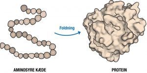 Som det kan ses på figur 1 folder aminosyrekæderne op omkring sig selv og danner tredimensionelle strukturer. Dette svarer til, at man tager en perlekæde og krøller den sammen. Den måde, som aminosyrekæden folder på, afhænger af, hvilke aminosyrer, der er i kæden. Fordi proteiner består af forskellige aminosyrer, har hvert protein sin helt egen måde at folde på og får derfor en helt unik form. Nogle proteiner består også af flere aminosyrekæder. Disse kæder binder til hinanden og folder også om hinanden. Hvis et protein ikke folder korrekt, fungerer det ikke, som det skal. Dette kan få alvorlige konsekvenser for en organismes sundhed.