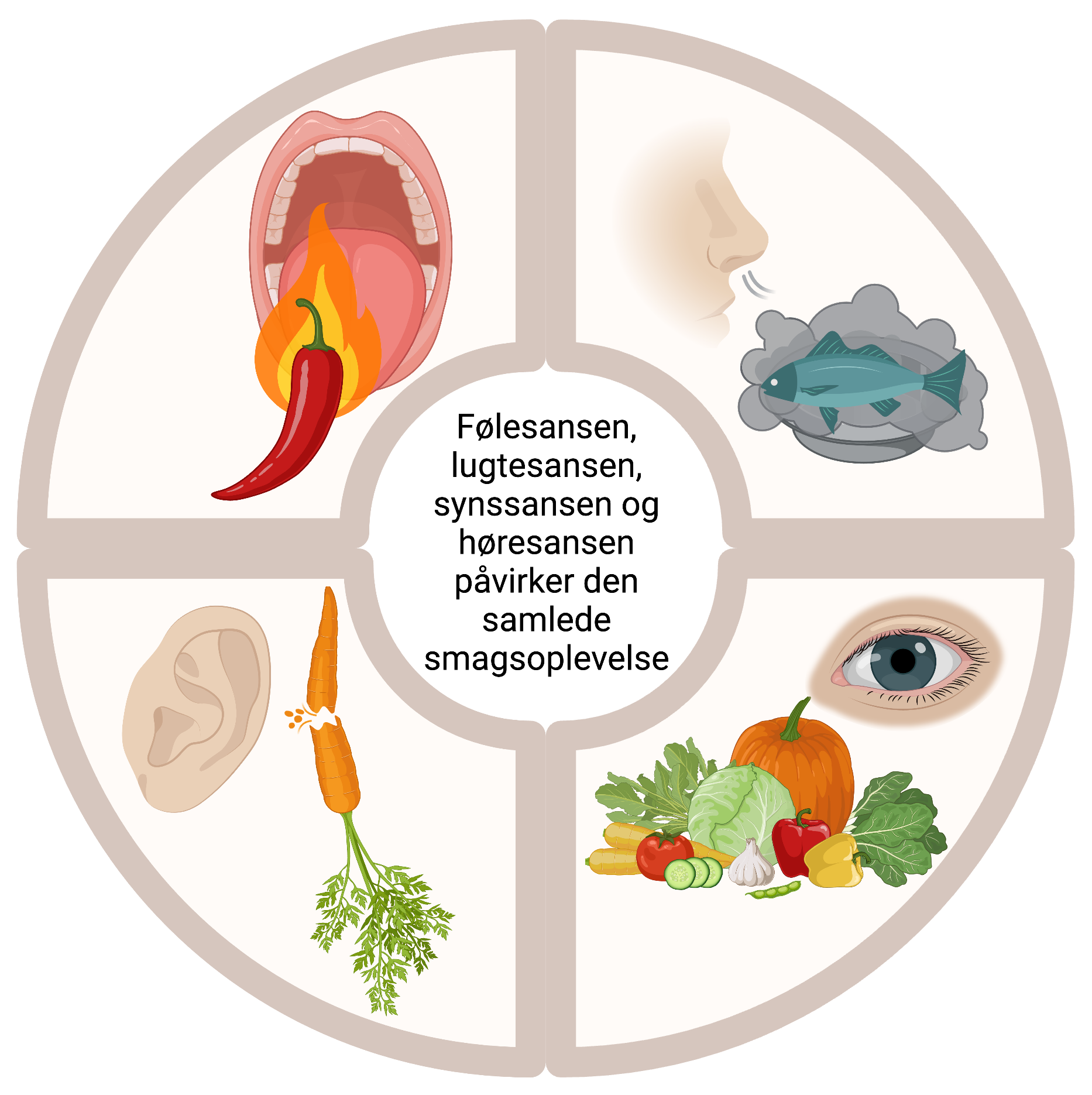 Figur 11. Alle sanser påvirker smagsoplevelsen. Udover naturligvis smagssansen påvirker de fire andre sanser også den samlede smagssans. Følesansen opfatter, hvis noget f.eks. er stærkt, sprødt eller blødt, mens lugtesansen kan nuancere maden og informere, om den f.eks. er røget. Synssansen ser om madrettens farver er indbydende, og høresansen sørger for at fødevarerne er friske ved at lytte til deres sprødhed.