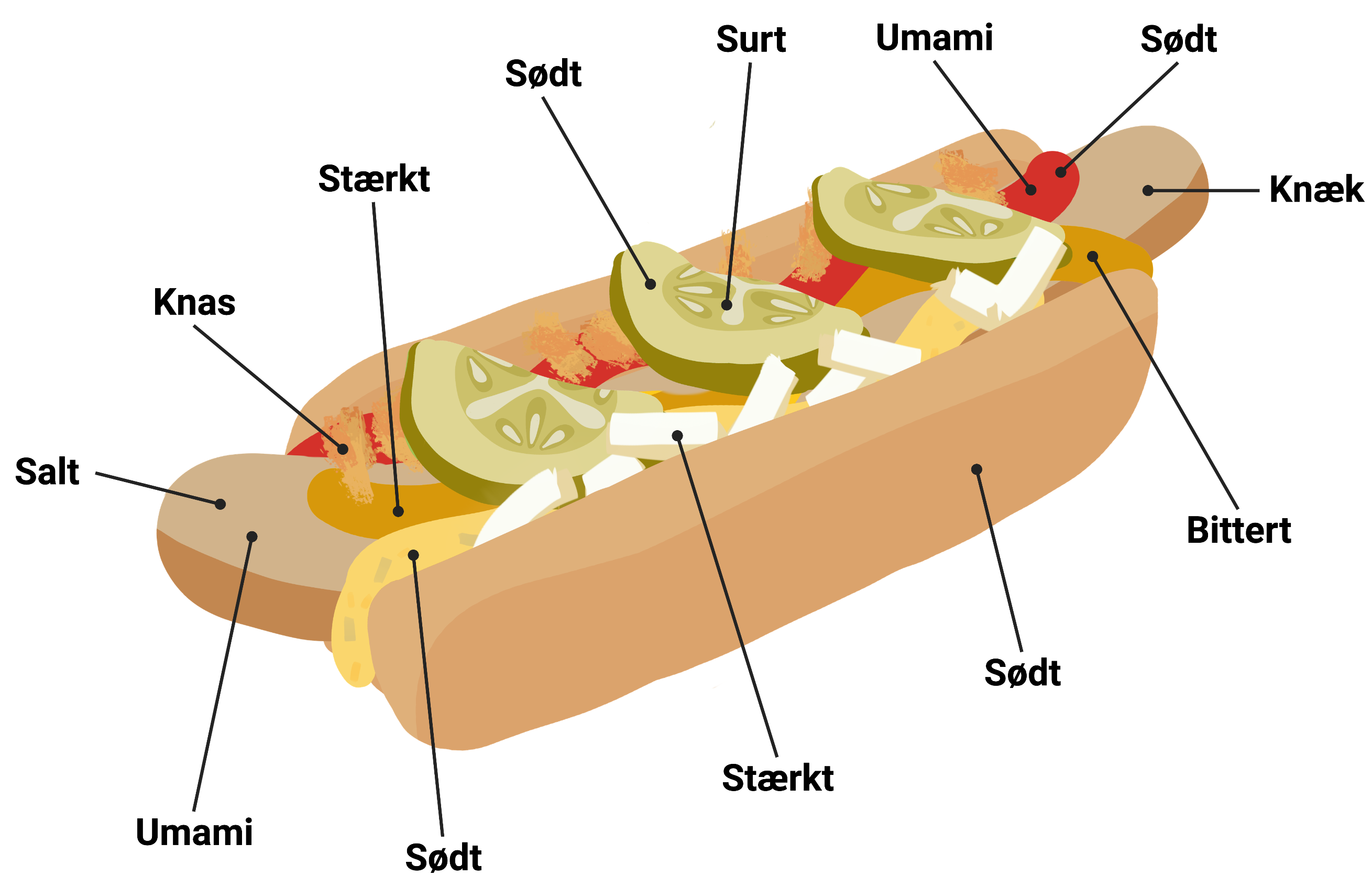 Figur 12. Hotdog-modellen. Hotdog-modellen beskriver, hvordan en hotdog indeholder alle de elementer, der skal til for at give en fuldendt smagsoplevelse. En hotdog indeholder de fem grundsmage samt noget knas og knæk, som tilsammen aktiverer alle fem sanser.