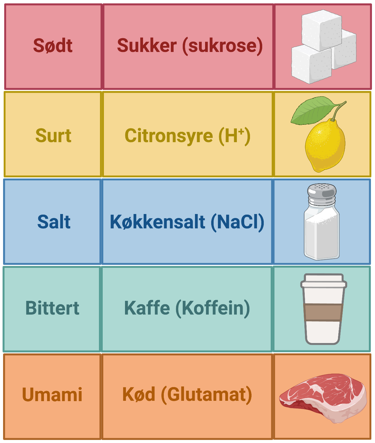 Har du lagt mærke til, at din tunge er fyldt med bittesmå knopper? Dette er smagsløg. Både tungen og dele af ganen er fyldt med omkring 5000 smagsløg. De hedder netop smagsløg, fordi de ligner bittesmå løg, hvis man kigger på dem helt tæt på. Hvert smagsløg består af op til 100 små celler, som kaldes smagsceller. Hver enkelt smagscelle kan genkende én af de fem grundsmage: Sødt, surt, salt, bittert eller umami. Når smagscellen opfanger en smag, sender den besked til hjernen. Hjernen ved nu, at denne smag er til stede i munden. På figur 1 får du et overblik over de fem grundsmage og eksempler på de steder, vi oftest møder dem.