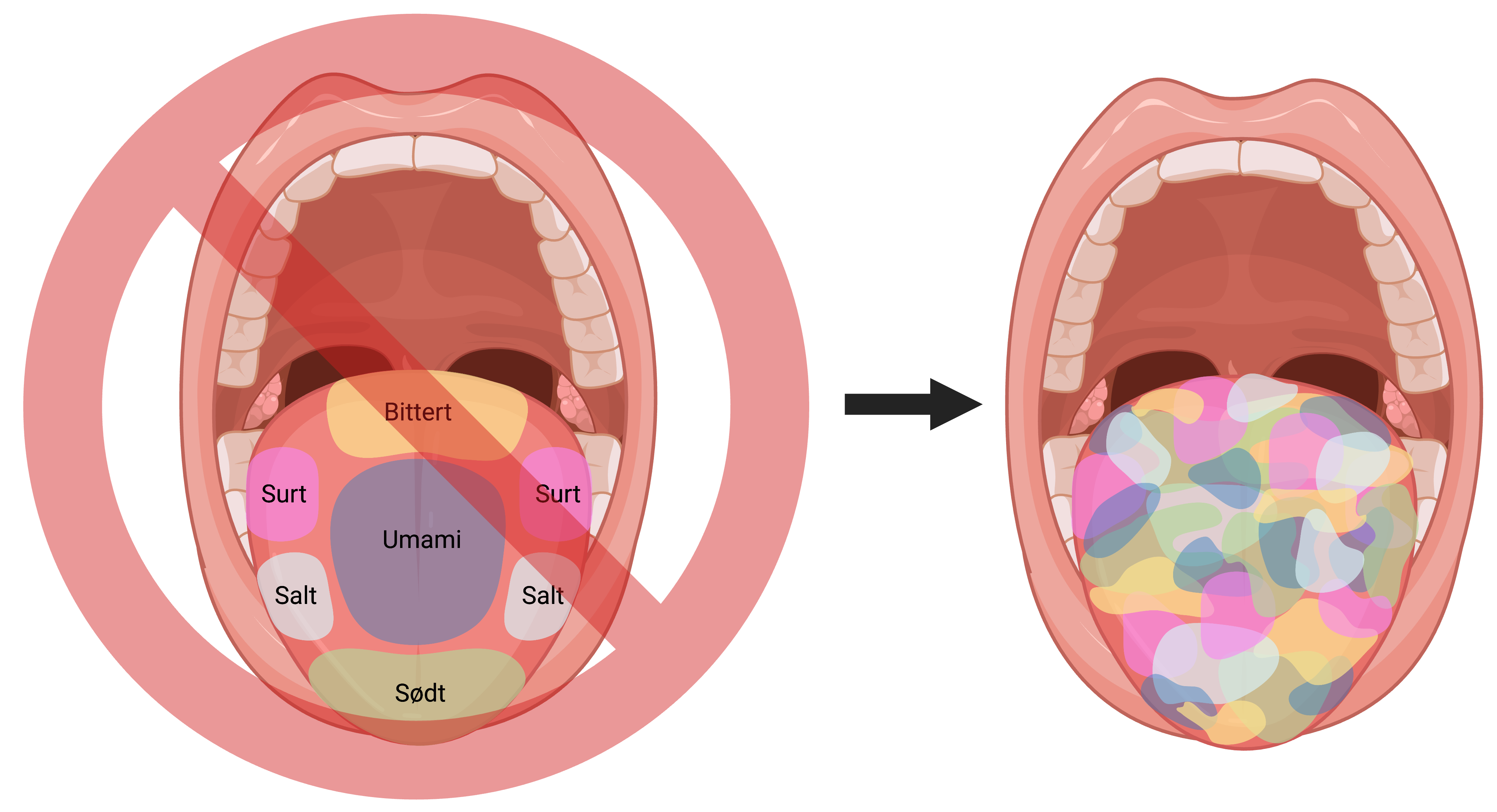 Figur 2. Smagsområder på tungen. Tungen inddeles ikke i de syv områder, som ses til venstre. Overalt på tungen kan alle grundsmagene opleves, som ses til højre.