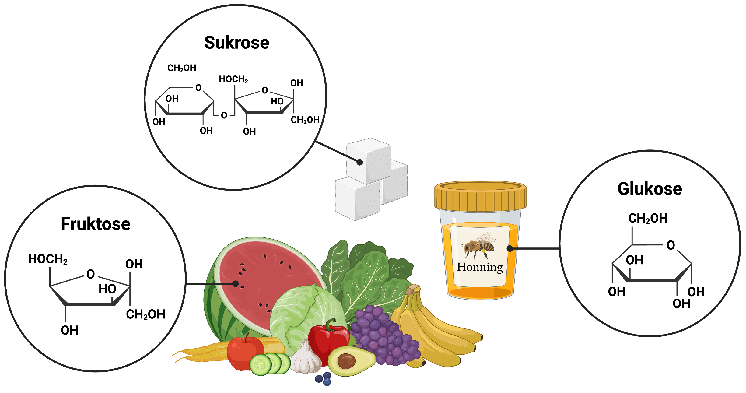 Figur 3. Sukkerstoffer. Tre naturlige sukkerstoffer er fruktose, som findes i modne frugter, sukrose, som bl.a. sukkerknalder består af, og glukose, som findes i honning.