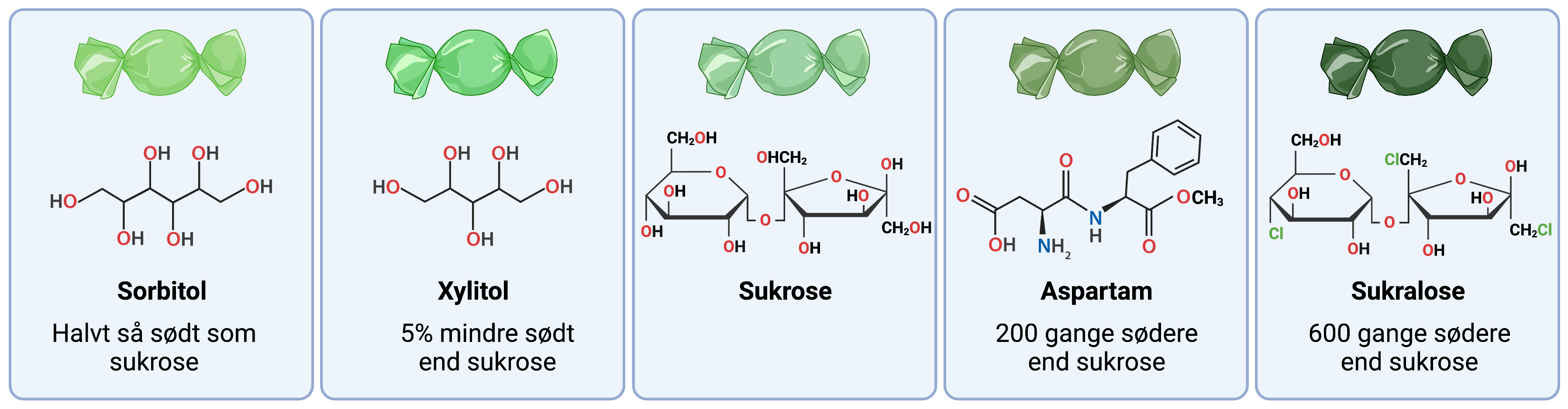 Naturlige sukkerstoffer har nogenlunde den samme struktur. Strukturen passer ned i smagsceller, som herefter signalerer til hjernen, at den søde smag er til stede. På figur 3 kan du se strukturen af sukrose, fruktose og glukose.