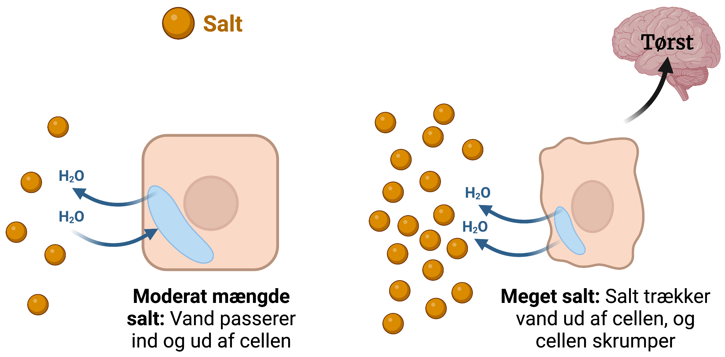 Figur 6. Saltets effekt på celler. Ved normale saltkoncentrationer er der balance mellem forholdet af vand og salt. Her bevæger vand sig konstant ind og ud af cellen (venstre). Er der store mængder salt omkring cellen, trækkes vand ud af cellen, og cellen skrumper ind (højre). Den skrumpede celle fortæller hjernen, at den mangler vand, og derfor begynder man at føle tørst.