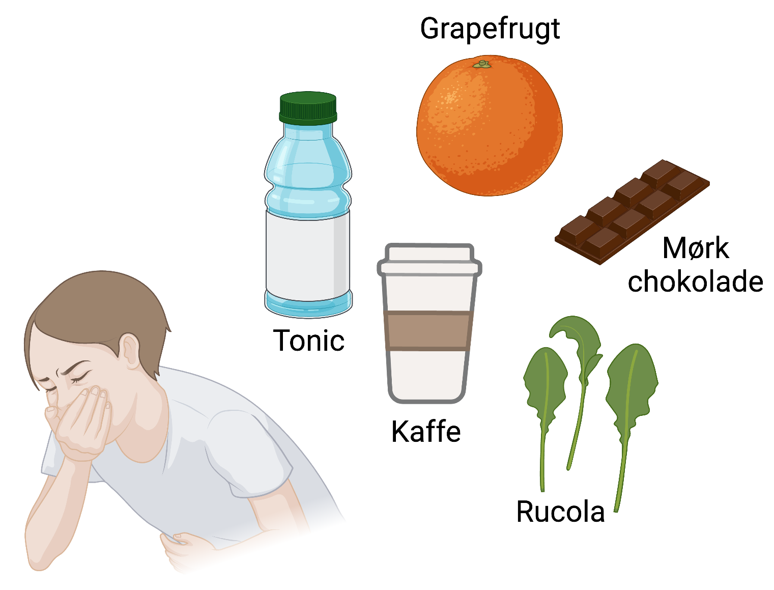 Figur 7. Bitre fødevarer. Børn synes ofte, at bitre fødevarer smager dårligt. Eksempler på bitre fødevarer er tonic, grapefrugt, kaffe, rucola og mørk chokolade.