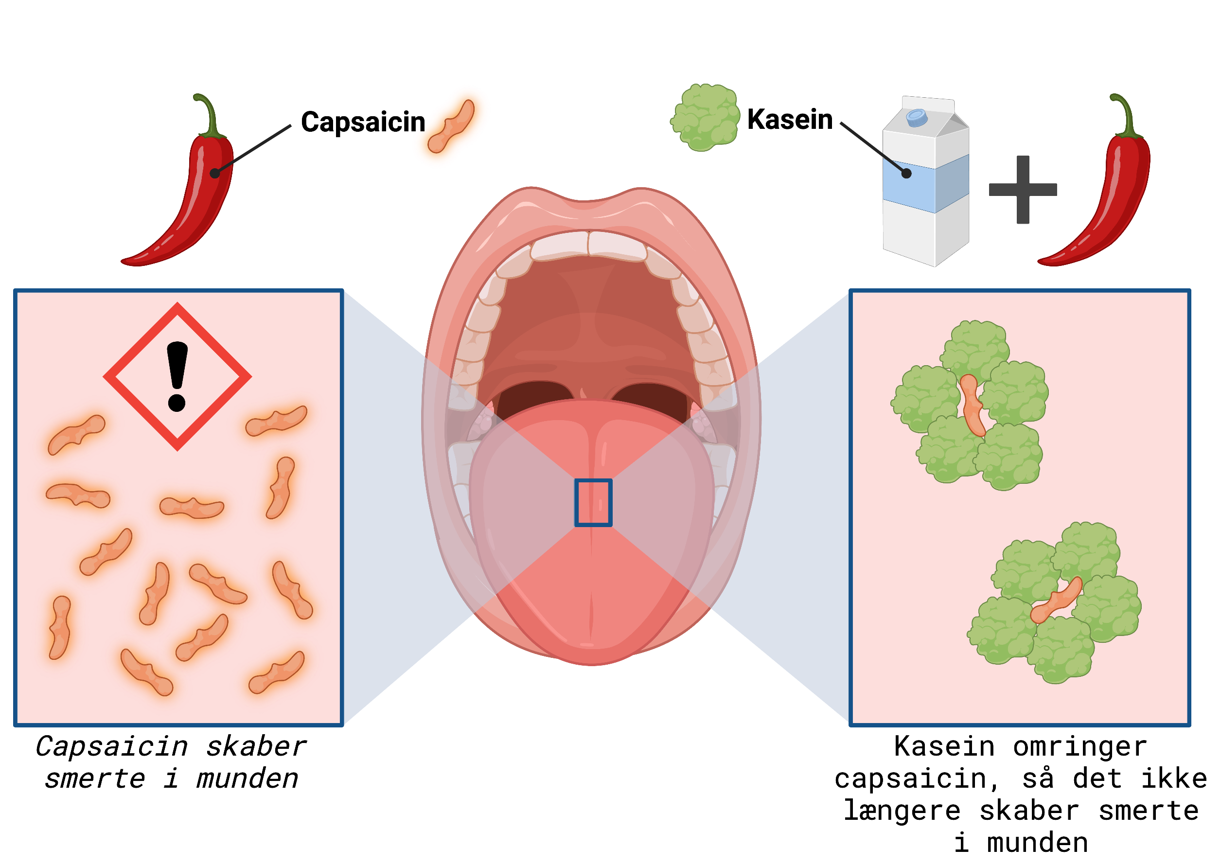 Figur 9. Kasein og capsaicin. Capsaicin fra chili kan fjernes fra munden ved hjælp af mælkens kasein. Kasein omringer capsaicin, så det ikke længere kan skabe smerte i munden.