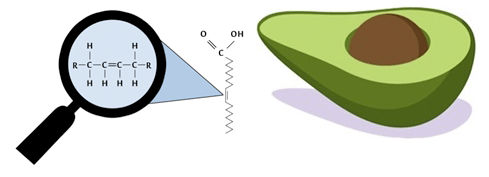 Figur 4. Enkeltumættede fedtsyrer indeholder én dobbeltbinding. Forstørrelsesglasset viser, hvordan carbonkæden ser ud med en dobbeltbinding. Sidekæden (R) varierer alt efter, hvor på fedtsyren udsnittet er taget fra. Enkeltumættede fedtsyrer stammer primært fra planter og findes bl.a. i avocado.