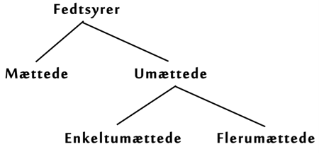 Figur 2. Fedtsyrer kan inddeles i mættede- og umættede fedtsyrer. Umættede inddeles yderligere i enkeltumættede og flerumættede fedtsyrer.