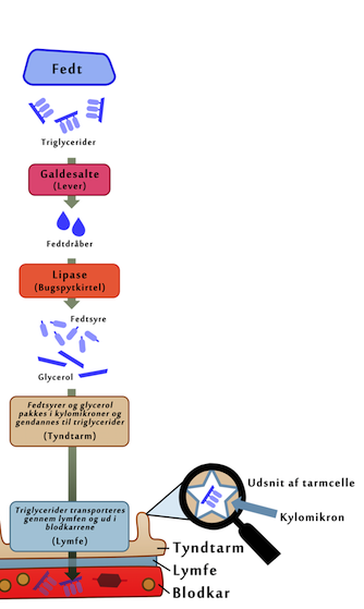 Figur 6. Nedbrydningen af fedt (triglycerider) starter med en emulgering ved hjælp af galdesalte. Det opdeler fedtet i mindre dråber. Det betyder, at lipase kan nedbryde triglyceridet til glycerol samt frie fedtsyre. I tarmcellen findes kylomikroner, som sørger for at opfange glycerol-molekylet samt de frie fedtsyrer og gendanne dem til triglycerider. Kylomikronerne transporteres først over i lymfen, hvorfra fedtet frigives til blodbanen, når kroppen har brug for det.