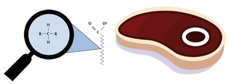 En mættet fedtsyre indeholdeholder ingen dobbeltbindinger mellem carbonatomerne. Forstørrelsesglasset i Figur 3 viser, hvordan ”en tak” ser ud i en mættet fedtsyre.