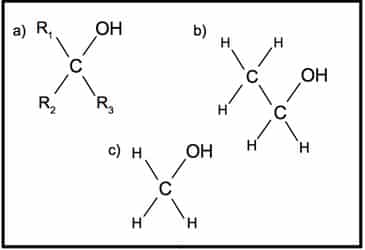 Figur 2. a) Den generelle struktur af alkoholer. R betegner en carbonsidekæde eller et hydrogenatom. b) Strukturen af ethanol. c) Strukturen af methanol.