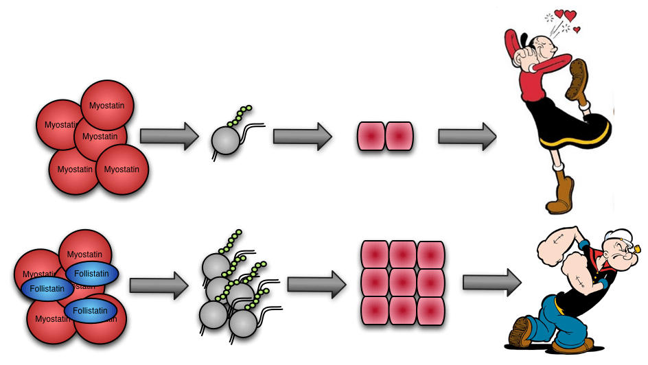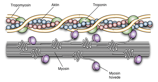 Figur 1 – Aktin og myosin i muskler. Et funktionelt aktin-molekyle er sat sammen af flere subunits (røde og blå cirkler), der holdes sammen ved hjælp af Tropomyosin og Troponin. Myosin-molekylerne bevirker, at aktin-komplekset kan glide frem og tilbage i en kontraherende bevægelse. Dette gøres ved, at myosin-hovederne binder til aktin, skubber det fremad og derefter slipper igen.