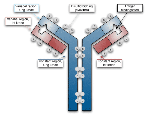 Figur 1 – Opbygningen af et antistof. De lette kæder er vist med rød, og de tunge kæder er vist med blå. Desuden er de konstante domæner for hver kæde vist med en mørkere nuance end de variable domæner. Bindingsstedet for proteiner fra fremmede organismer er vist med trekanter og firkanter, hvilket indikerer at hver variabel del genkender forskellige strukturer. Dog genkender hver kæde, f.eks. de to tunge kæder, i et antistof den samme struktur. Kæderne i et antstof er holdt sammen med svovlsulfidbindinger, hvilket er vist med de grå cirkler.