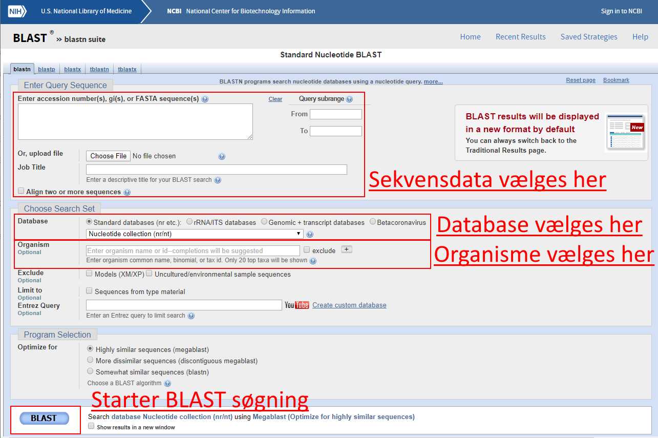 I figur 18 kan søgesiden for BLAST ses. Den øverste markering viser felterne, hvor der ens sekvensdata indtastes, den midterste markering viser, hvor man kan vælge, hvilken database man vil blaste imod, samt hvilken organisme der skal søges i. De mest benyttede databaser er dem, der indeholder flest sekvenser. Disse databaser er følgende: