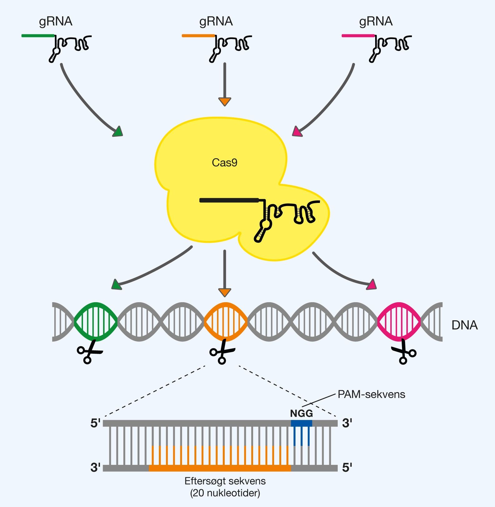 På figur 2 ses hvordan kan målsøge forskellige DNA-sekvenser, ved udskiftning af gRNA i Cas9 og placeringen af PAM-sekvensen i forhold til de målsøgte 20 nukleotider.
