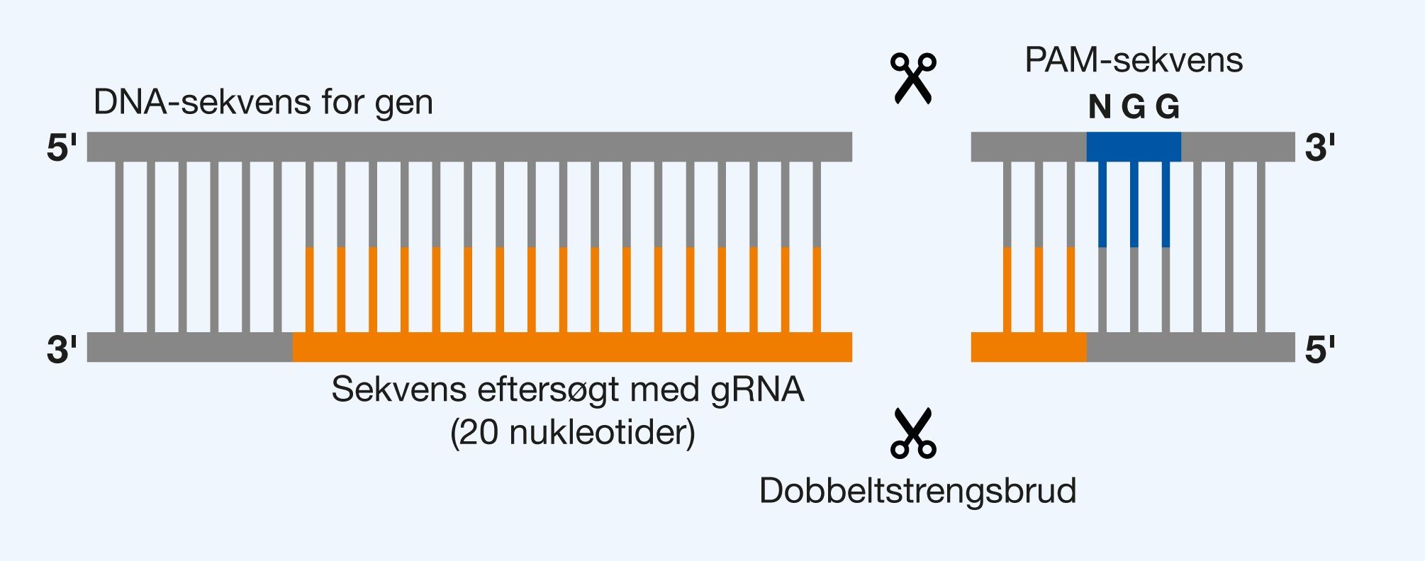• PAM-sekvensen aflæses på den ene streng, mens identifikationen med gRNA sker på den anden streng.