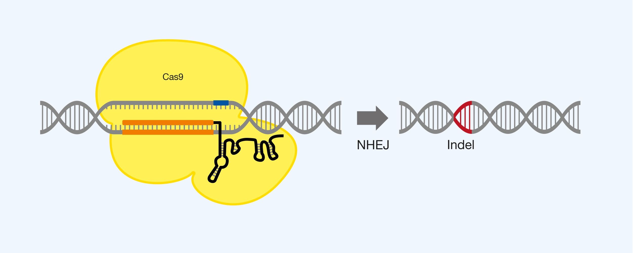 Ødelæggelse af genstrukturen ved små insertioner eller deletioner (samlet kaldet indels) i DNA-sekvensen. Cas9 anvendes med gRNA til at udvælge lokationen for dobbeltstrengsbruddet, hvorefter en indel opstår som resultat af mutationel NHEJ-reparation af bruddet. Multiplexing med flere stykker gRNA kan anvendes til at lave flere destruktioner af det samme gen eller forskellige gener på én gang. Se figur 5.