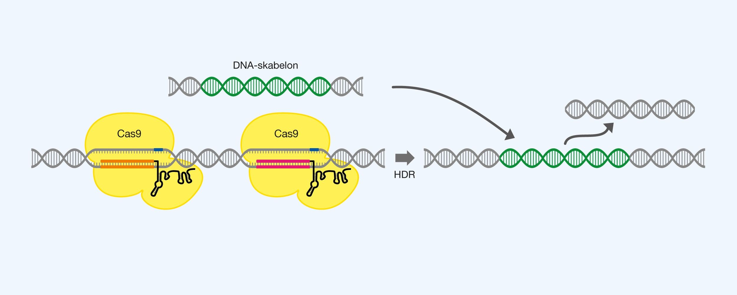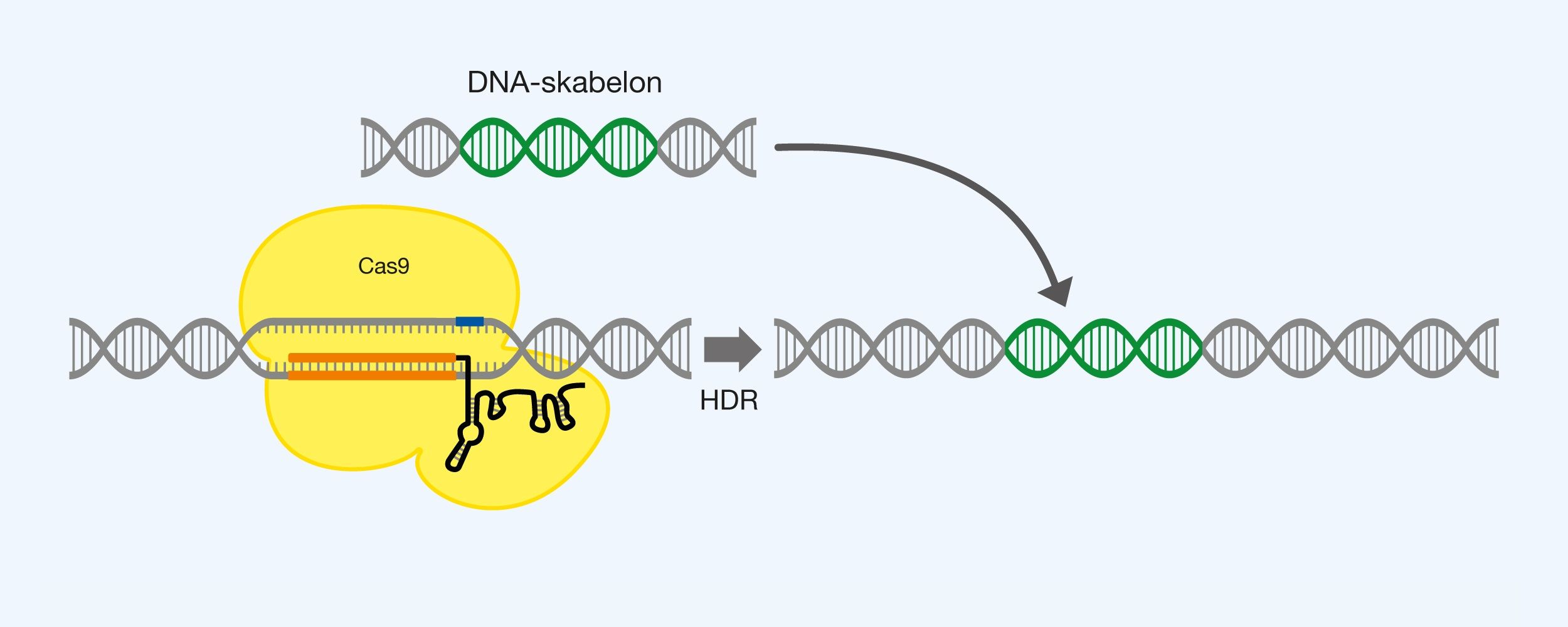 HDR kan kun basere sin reparation på baggrund af de homologe ender af DNA-skabelonen, men ikke hvad der er imellem. Derfor kan man tvinge reparationssystemet til at indsætte selvvalgte DNA-sekvenser, så længe de har homologe ender. Når man vil indsætte en sekvens i en bestemt position i DNA’et, danner man først dobbeltstrengsbruddet med sit Cas9. Ved derefter at indføre en kunstig DNA-skabelon med homologe ender, kan man indsætte sekvensen i bruddet ved udnyttelse af reparationsmekanismen. Dette er illustreret på figur 1.