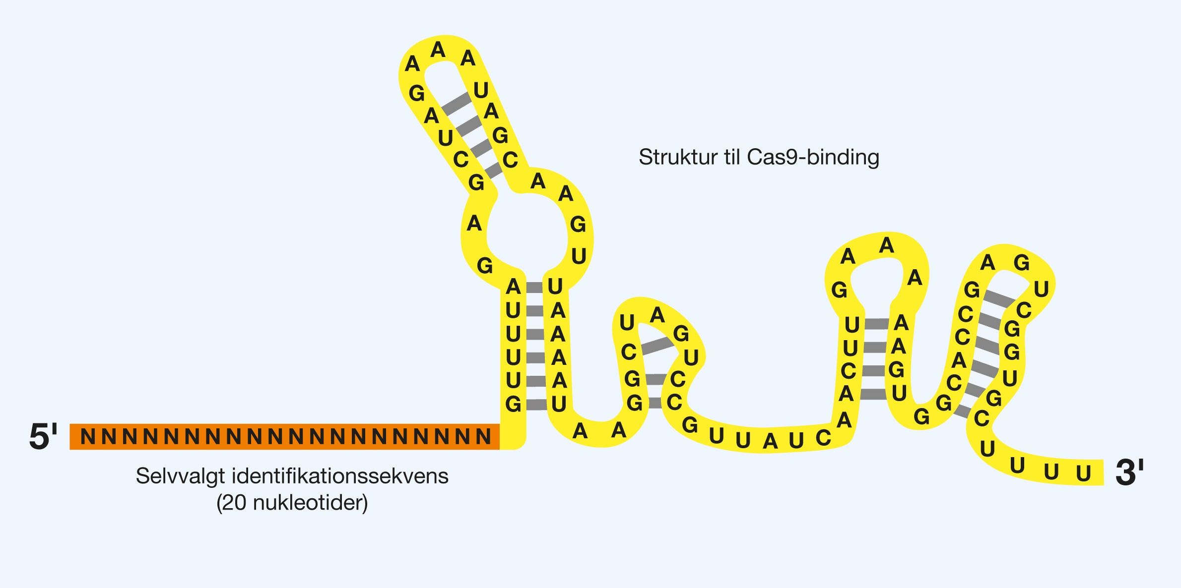 Figur 9. Strukturen af sgRNA, hvor identifikationssekvensen på 20 nukleotider i 5′-enden kan varieres efter eget valg, sådan at forskellige DNA-sekvenser kan eftersøges og blive kløvet af Cas9. ‘N’ er ensbetydende med, at der kan være en enhver nukleotid på positionen. Den faste struktur mod 3′-enden bruges af Cas9 til at binde gRNA.