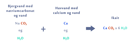 Det resulterer i bjergvand med et højt indhold af natriumcarbonat (NaCO3), som løber ned under fjorden via et system af revner og bliver presset op gennem bunden af fjorden. Havvandet her indeholder calcium (Ca), som reagerer med carbonationen (CO32-) fra bjergvandet og vand (H2O). Tilsammen danner det ikait (CaCO3 x 6 H2O), som består af kalk (CaCO3) med 6 vandmolekyler bundet til sig. Reaktionen kan ses i figur 10.