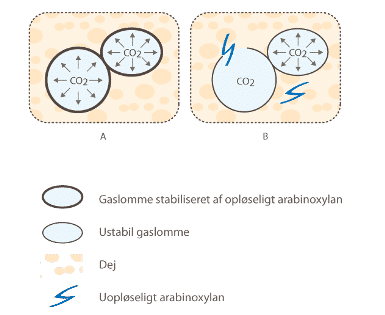 A: Gaslommerne i brødet stabiliseres af opløseligt arabinoxylan. B: Uopløseligt arabinoxylan er en fysisk barriere, der hindrer dannelsen af glutennetværket.