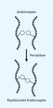 Peroxidaser (oxidoreduktaser) kan ud over at styrke glutennetværket ved at fremme dannelsen af svovlbroer, også katalysere krydsbinding af arabinoxylan. Det sker ved dannelse af ferulinsyredimerer (bindinger mellem to ferulinsyremolekyler) (Fig. 35). Dannelsen af ferulinsyredimerer bidrager til at styrke dejen – muligvis pga. interaktioner med glutennetværket.