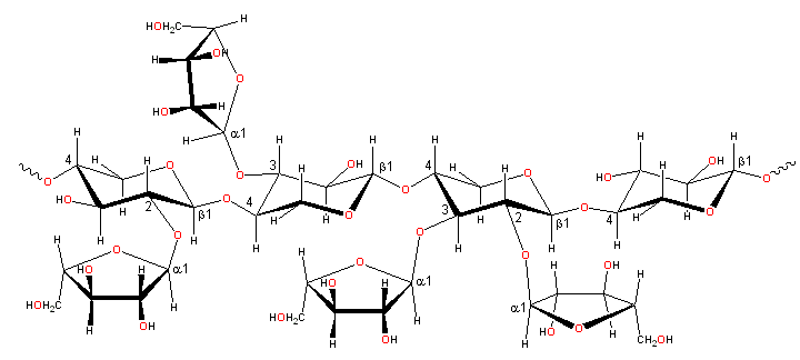Xylosemolekylerne sidder sammen vha. β-(1,4)-glykosidbindinger, og danner polymeren xylan. Til nogle af xylosemolekylerne er der bundet monosakkaridet arabinose (Fig. 30).