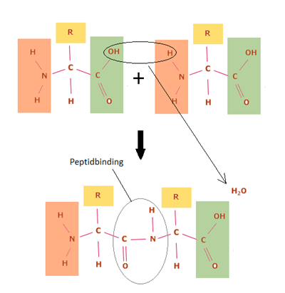 Proteiner dannes ved sammenkædning af aminosyrer. Aminosyrer sammenkædes via en kemisk reaktion mellem aminogruppen på én aminosyre og carboxylsyregruppen på en anden. Herved dannes en peptidbinding mellem de to aminosyrer. Reaktionen kaldes en kondensationsreaktion, da der fraspaltes vand (se figur 25). Flere aminosyrer, der er kædet sammen via peptidbindinger, danner en polypeptid kæde. De fleste polypeptid kæder består af mellem 50 og 2000 aminosyrer og betegnes proteiner. Kæder, der består af færre end 50 aminosyrer, betegnes peptider.