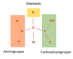 Figur 23. Den kemiske struktur af aminosyrer. Fire kemiske grupper er bundet til det centrale carbon-atom. Sidekæden ’R’ varierer i de 20 forskellige aminosyrer, og det er derfor denne gruppe, der giver aminosyren sine specifikke karakteristika.