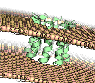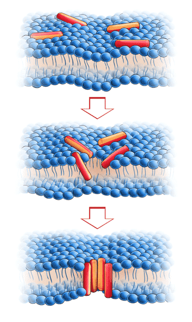 Figur 31. Når AMP’et, trichotoxin, har bundet sig til cellemembranen, vil 8 identiske peptider danne en transmembran kanal. Trichotoxin peptider sidder herefter i en kvartenærstruktur i cellemembranen.