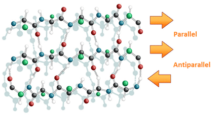 Figur 29. β-strenge, der ligger ved siden af hinanden i et β-sheet, kan enten være parallelle eller antiparallelle.