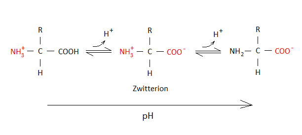 I vandige opløsninger ved neutral pH-værdi er aminosyrer oftest zwitterioner, hvilket betyder at aminogruppen er protoneret (NH3+) og carboxylsyregruppen er deprotoneret (COO–). Hvorvidt aminosyrer er ioniseret eller ikke er ioniseret afhænger af pH-værdien (se figur 24).