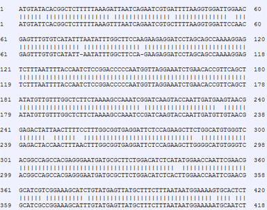 Figur 16. Sequence alignment output. Stregerne angiver hvor der er sammenhæng mellem de to sekvenser.