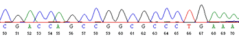 Figur 14. Eksempel på datasæt for Sanger sekventering. Hver base giver et bestemt flourescens-udslag der aflæses. Dette afslører sekvensen af nukleotider i DNA’et.