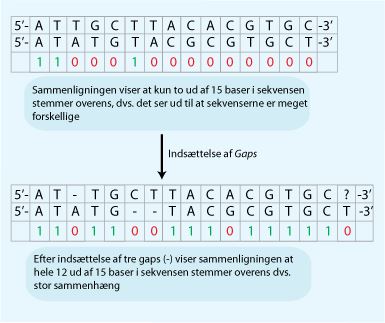 Hvis sekvenserne ikke er lige lange, eller når der er brug for det, indsættes gaps som forlænger et stykke af sekvensen. Hvis de ikke blev indsat, ville to relativt ens molekyler se ud til at være vidt forskellige. Indsættelsen af gaps er illustreret i figur 15. I figur 16 er vist hvordan et sequence alignment output i praksis kan se ud.