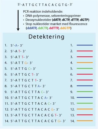 Ved Sanger sekventering benyttes også en PCR-reaktion, og princippet er det samme som ved opformering af DNA. Der tilsættes DNA-polymerase, primer (kun én primer) og nukleotider (dNTP, hvor N står for en nukleobase, dvs. enten A, T, C eller G) samt nogle modificerede nukleotider, som stopper replikationen. Disse stop-nukleotider er di-deoxynukleotider (ddNTP) som er mærket med hver sit fluorescerende stof der kan detekteres. Når PCR-reaktionen er løbet til ende, vil der pga. stopnukleotiderne være opstået DNA-fragmenter med forskellig størrelse. Alle fragmenterne starter det samme sted, nemlig med den primer man har anvendt i reaktionen. Fragmenterne stopper med et ddNTP der fluorescerer i en farve. Farven angiver hvilket nukleotid der er på den pågældende position. DNA-fragmenterne kan adskilles efter størrelse. Enten ved hjælp af en elektroforese-gel eller ved kapillar elektroforese som er det mest benyttede i dag. Det bagvedliggende princip er det samme. Fragmenterne vil trænge igennem gelen med forskellig hastighed – de små hurtigst og de store langsomst. Nu kan sekvensen af DNA aflæses, ved at se hvilken farve de enkelte bånd fluorescerer. Det afslører hvilket stopnukleotid der er tale om. I figur 13 vil det DNA-fragment der trænger hurtigst gennem gelen være mærket med en blå fluorescens, som svarer til basen A, og det kan derfor konkluderes at det første bogstav i sekvensen er A.