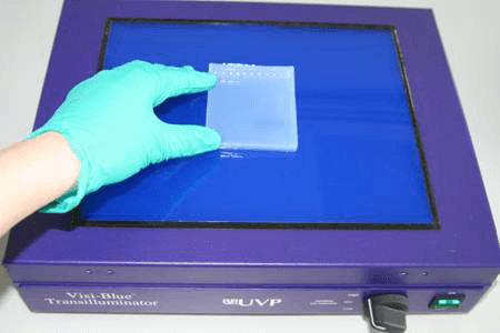 Den kørte elektroforesegel lægges midt på transilluminatoren, og luftbobler presses forsigtigt ud. Lysintensiteten på transilluminatoren sættes på ”High”.