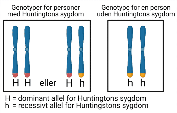 Eksemplet med Huntingtons sygdom er vist i figur 4, hvor genotypen for personer med sygdommen er vist i kassen til venstre, og genotypen for personer uden sygdommen er vist i kassen til højre. Som figuren viser, skal man have begge alleler for det recessive gen (h) for at være rask, mens personer med sygdommen enten har et eller begge alleler med det dominante sygdomsfremkaldende gen (H). I dette eksempel kan sammenhængen mellem genotypen og fænotypen derfor blive beskrevet, som at den sygdomsfremkaldende allel er dominant.