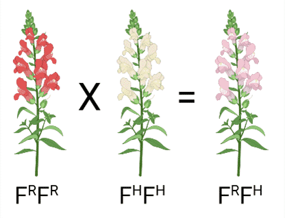 Bestemte arter af planter (Haveløvemund, Antirrhinum majus) kan have blomster, som enten er hvide, røde eller lyserøde. En krydsning mellem en homozygot plante med hvide blomster og en homozygot plante med røde blomster giver afkom med lyserøde blomster. Allelerne for hvide og røde blomster er derfor semidominante/codominante, da fænotypen giver en kombination af de to, og ikke en afvigelse af den ene farve til fordel for den anden. Fordi allelerne er semidominante/codominante, skrives genotypen med store bogstaver samt en annotation: FR FR for blomster med den røde farve, FH FH for blomster med den hvide farve og FR FH for blomster med den lyserøde farve.
