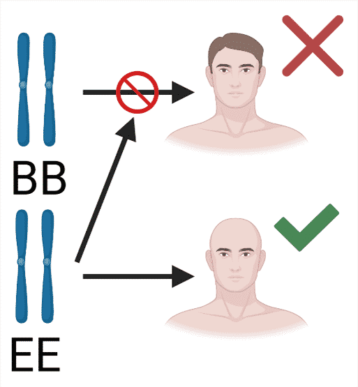 Dominant, recessiv, semidominans og codominans er alle egenskaber, der involverer et par alleler og deres indflydelse på hinanden. Epistasi er, hvordan forskellige gener interagerer og har indflydelse på hinanden. Epistasi er lettest at forklare med et eksempel: Figur 6 viser en person, der har genotypen for at få brunt hår. Umiddelbart er der ikke noget der tyder på, at personen ikke vil få brunt hår, da individet er homozygot for den brune hårfarve. Problemet er bare, at personen også er homozygot for genet, der gør ham skaldet. Fordi han har genet, som gør ham skaldet, kan den brune hårfarve ikke komme til sin fulde ret og blive derfor ikke vist i fænotypen. Genet for skaldethed har derfor haft en epistatisk indflydelse på genet for hårfarve.