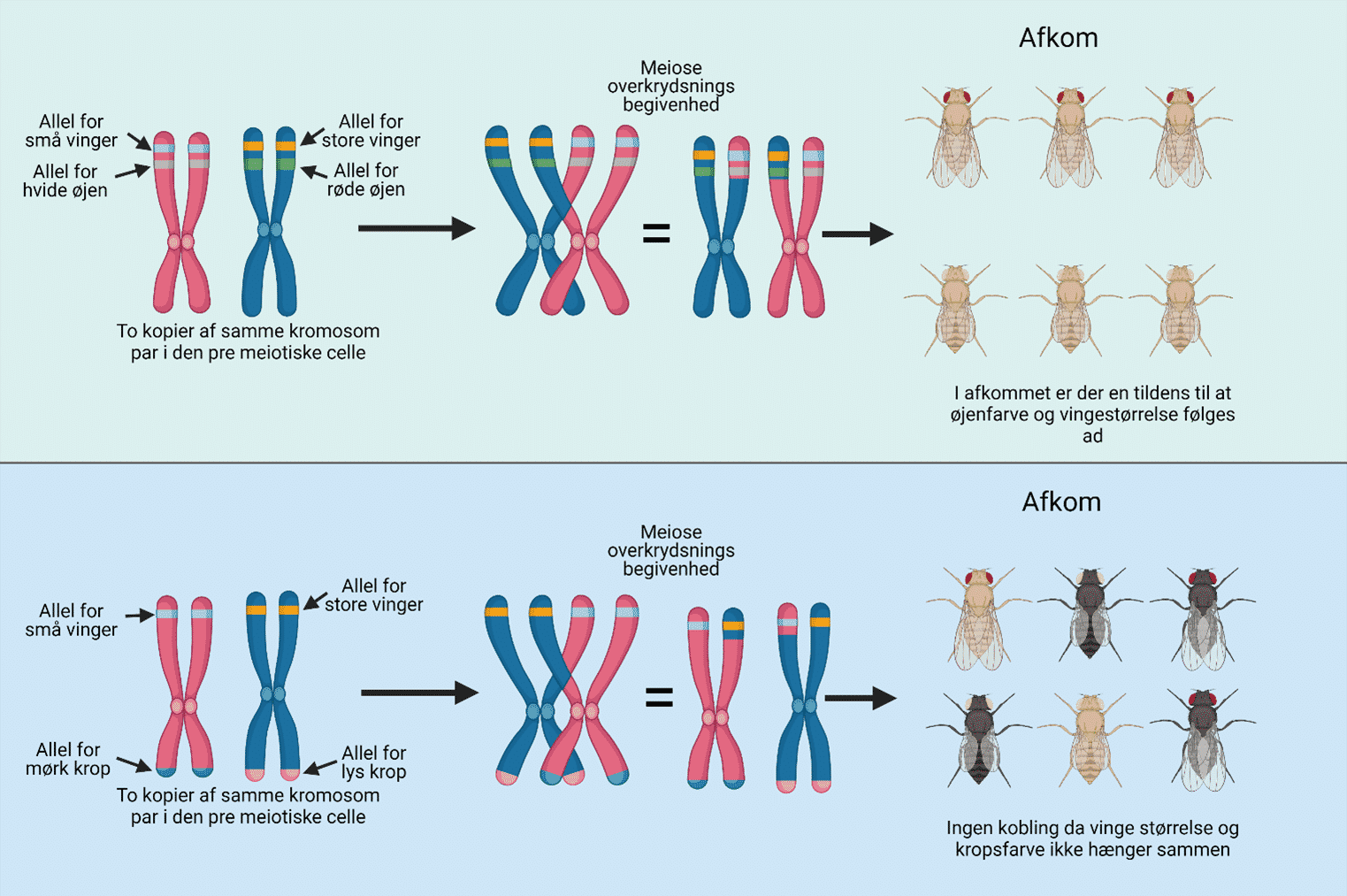 Figur 7: Eksempel på koblede gener i bananfluen. Fænotypen røde øjne og store vinger følges ad og er derfor koblede. Modsat så er fænotypen for mørk krop og vingestørrelse uafhængige og derfor ikke koblede.