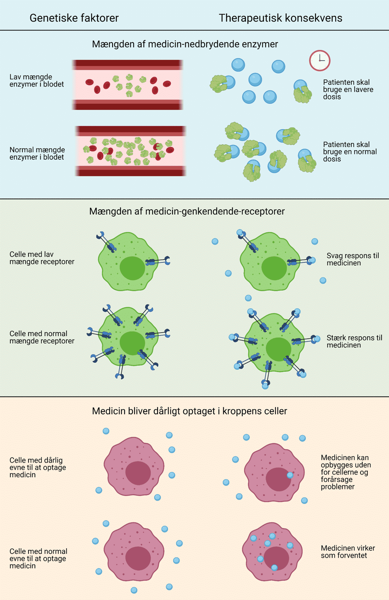 Medicin er en bred term for rigtig mange forskellige stoffer, som har til formål at kurere diverse sygdomme og tilstande, såsom smerte. For at medicinen kan udføre sin opgave, skal den nå ud til de steder i kroppen, som er ramt af sygdommen. Hvis man har ondt i hovedet, skal medicinen nå op til hovedet og lindre smerten. Efter medicinen har gennemført sin opgave, skal den også forsvinde fra kroppen igen. Kroppens måde at fjerne medicin på er, i de fleste tilfælde, at producere enzymer, som nedbryder medicinen. Produktionen af disse enzymer er afhængig af individets DNA, hvilket betyder, at en DNA-analyse kan hjælpe lægerne til at finde den rigtige dosis medicin. Et eksempel er antidepressionsmedicinen, amitriptyline, hvis nedbrydning er afhængig af to gener (CYP2D6 og CYP2C19). Hvis patienten har en genotype, der giver en høj produktion af amitriptyline-nedbrydende enzymer, bliver medicinen nedbrudt hurtigere end forventet, og patienten bør derfor få en højere dosering end patienter med lav produktion af amitriptyline-nedbrydende enzymer. Det bliver derfor anbefalet, at undersøge patienternes CYP2D6 og CYP2C19 genotype, for at finde en passende dosering af amitriptyline.