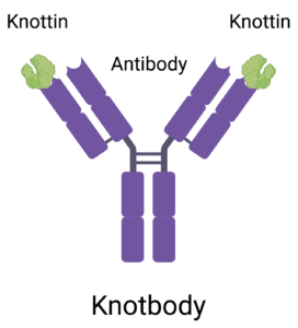 Forskere fra en biotekvirksomhed i England (Maxion Therapeutics) har gennem de sidste 10 år arbejdet på at udnytte knottins’ naturlige evner til at ramme de kanaler og receptorer, som antistoffer historisk set har været udfordrede i at ramme. De har gjort dette ved at fusionere knottins med antistoffer. Mere specifikt har de klonet DNA-sekvenser, der koder for forskellige knottins, ind i den del af antistoffet, som står for antigengenkendelse. På den måde har de skabt antistoffer, som får specificitet til ionkanaler eller GPCRer fra knottins.