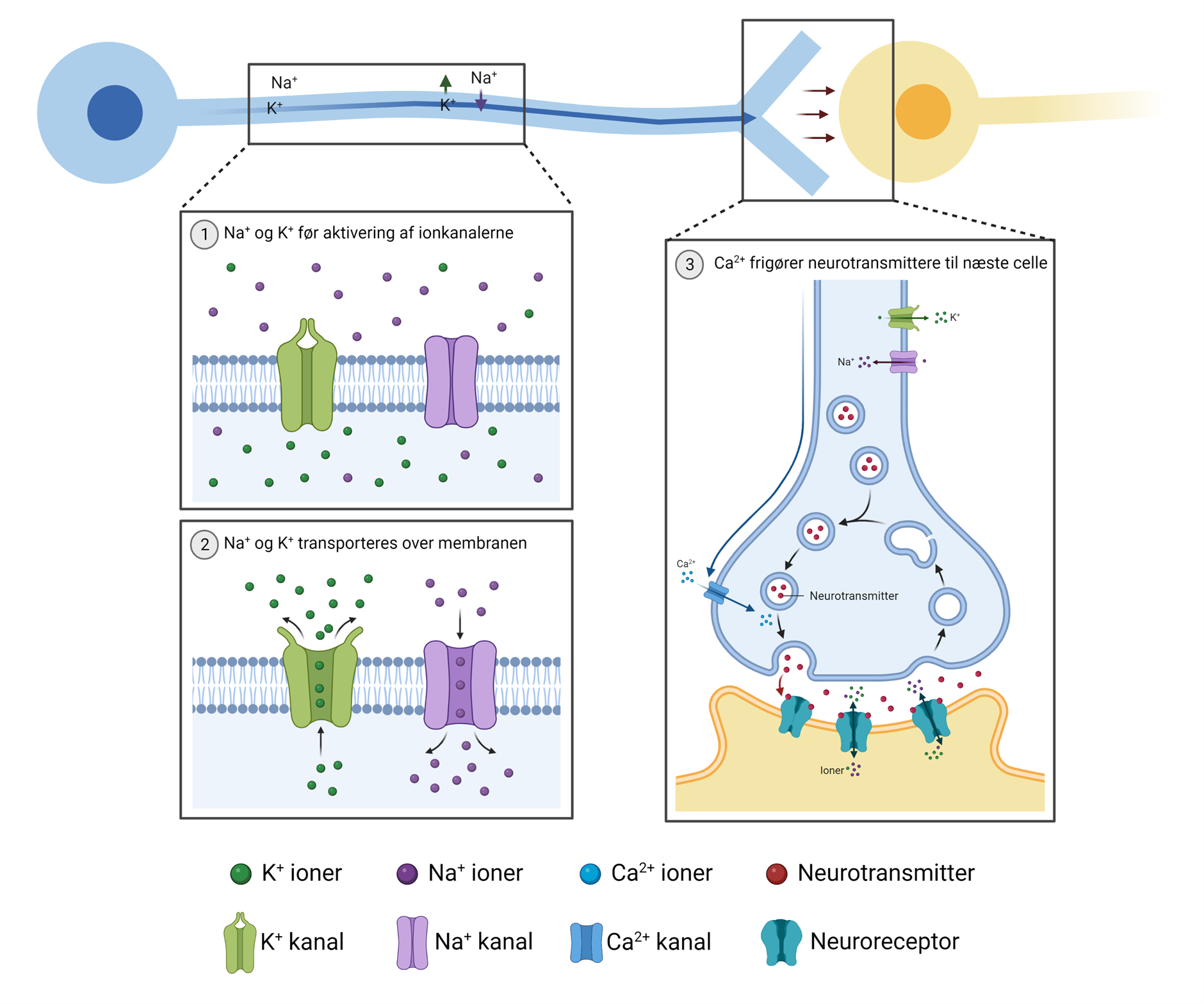 Figur 8. Boks 1. En Na+ og K+ kanal i hvilestadie. Boks 2. En Na+ og K+ kanal i signalerende stadie. Denne signalering løber ned langs hele nervefiberen set i nervecellen øverst på figuren, indtil signaleringen når til nerveenden (Boks 3). Boks 3. Når signaleringen når til enden, aktiveres Ca2+ kanaler, som sender Ca2+ ind i nervecellen, hvilket resulterer i at vesikler med neurotransmittere (fx acetylcholin) skydes ud af nervecellen og sender signalet videre ved at binde til neuroreceptorer på den næste celle. Disse neuroreceptorer er neurotransmitter-afhængige ionkanaler, som åbner for ion strøm ind i cellen ved kontakt med den korrekte neurotransmitter, hvorefter processen gentages i den nye nervecelle.